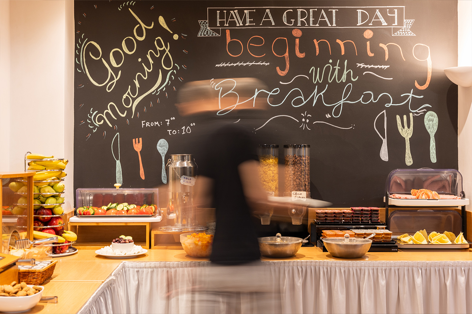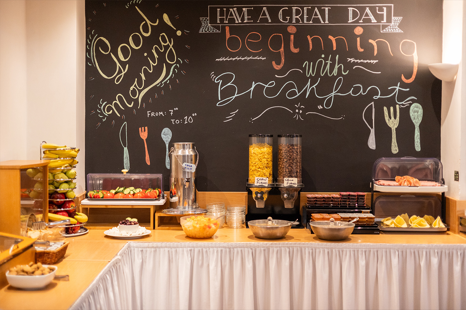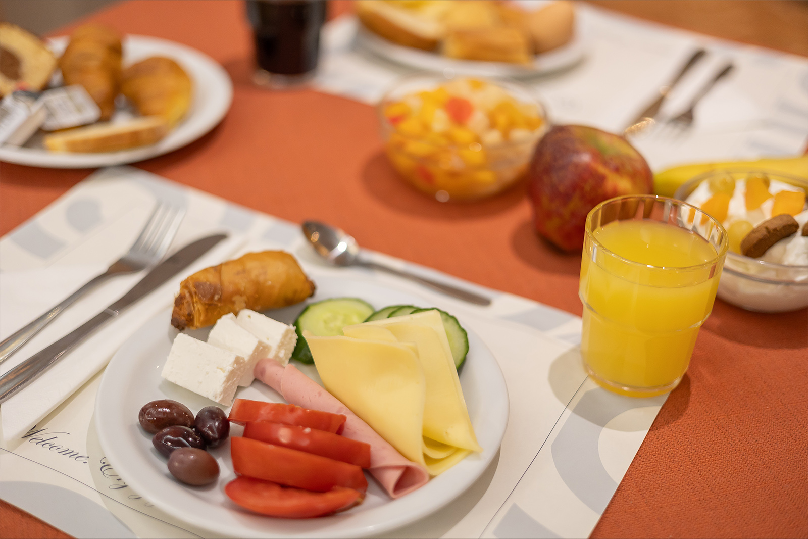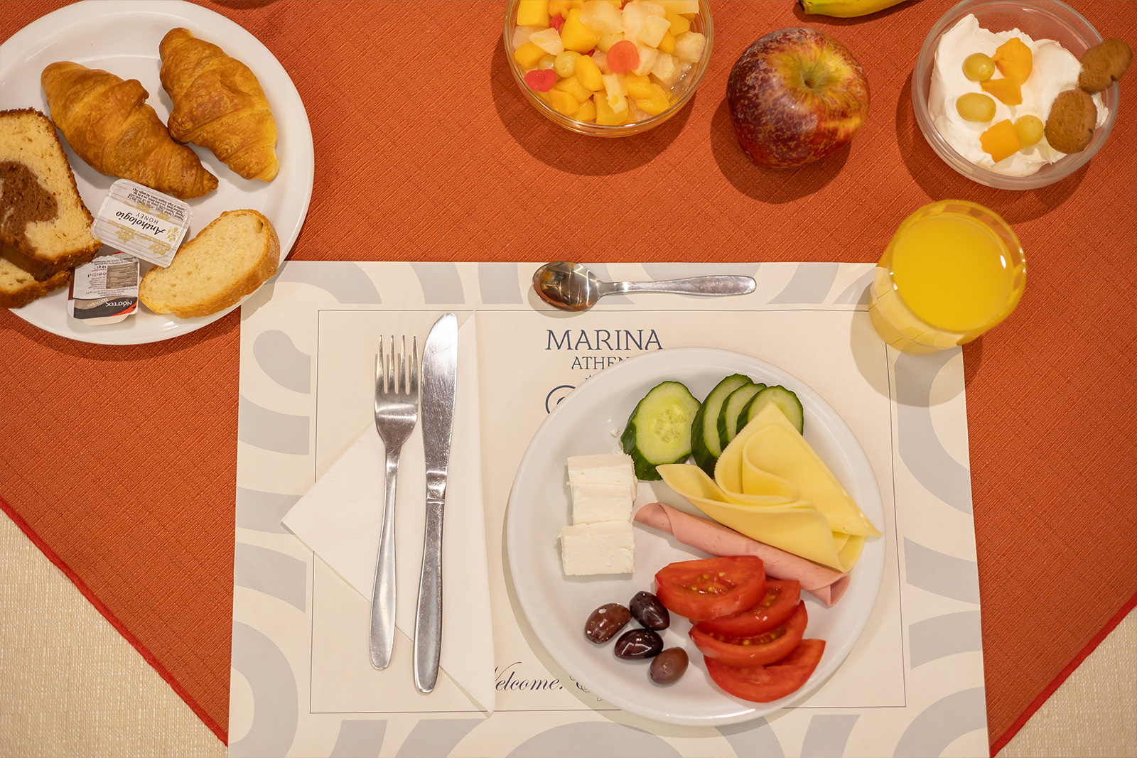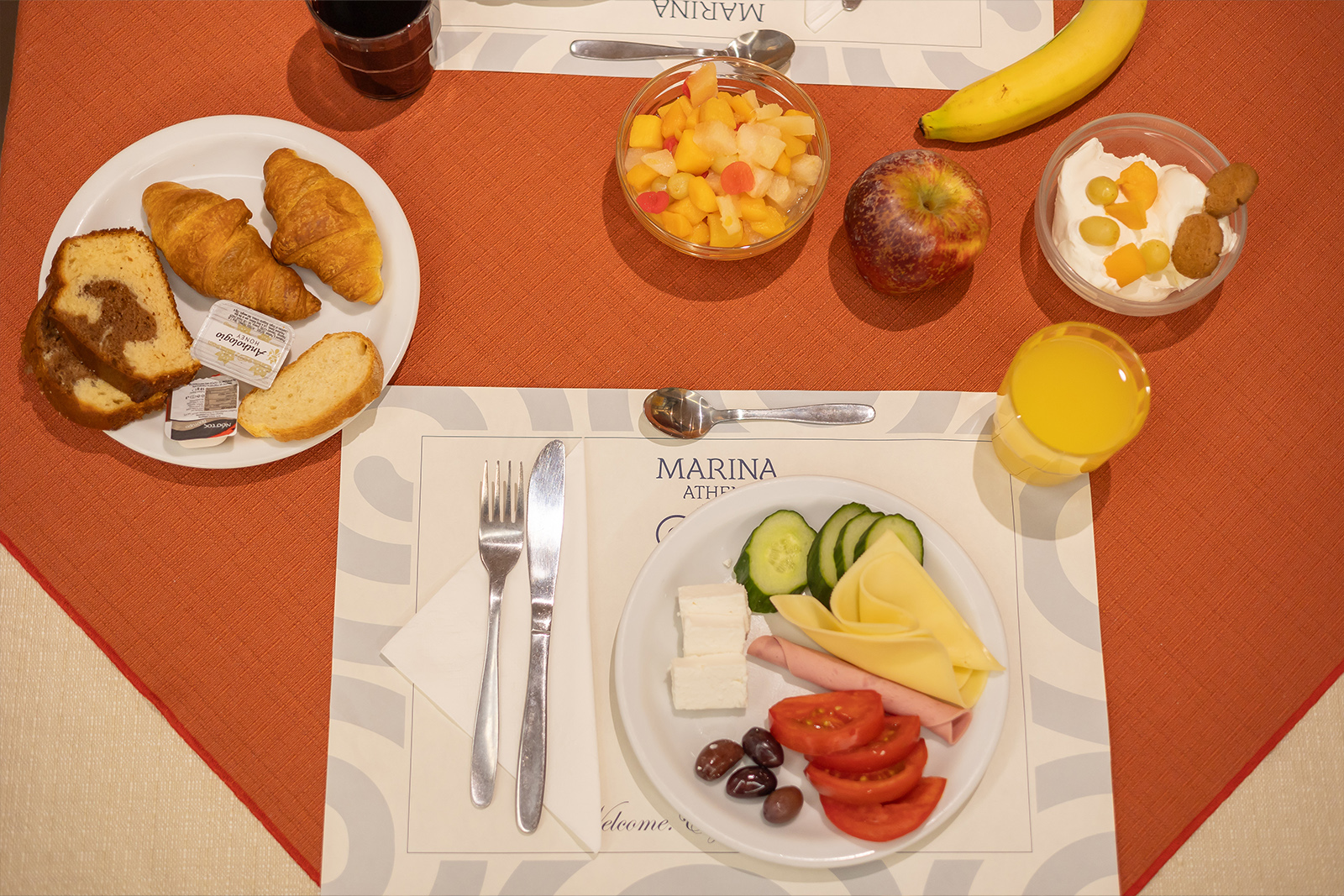 Start your day at Marina Hotel with a rich breakfast including freshly baked cakes, biscuits, ham, cheese, tomatoes, eggs, beans and fresh juices. Enjoy the delicious variety and high quality of our dishes for a dynamic and tasty start to your day.